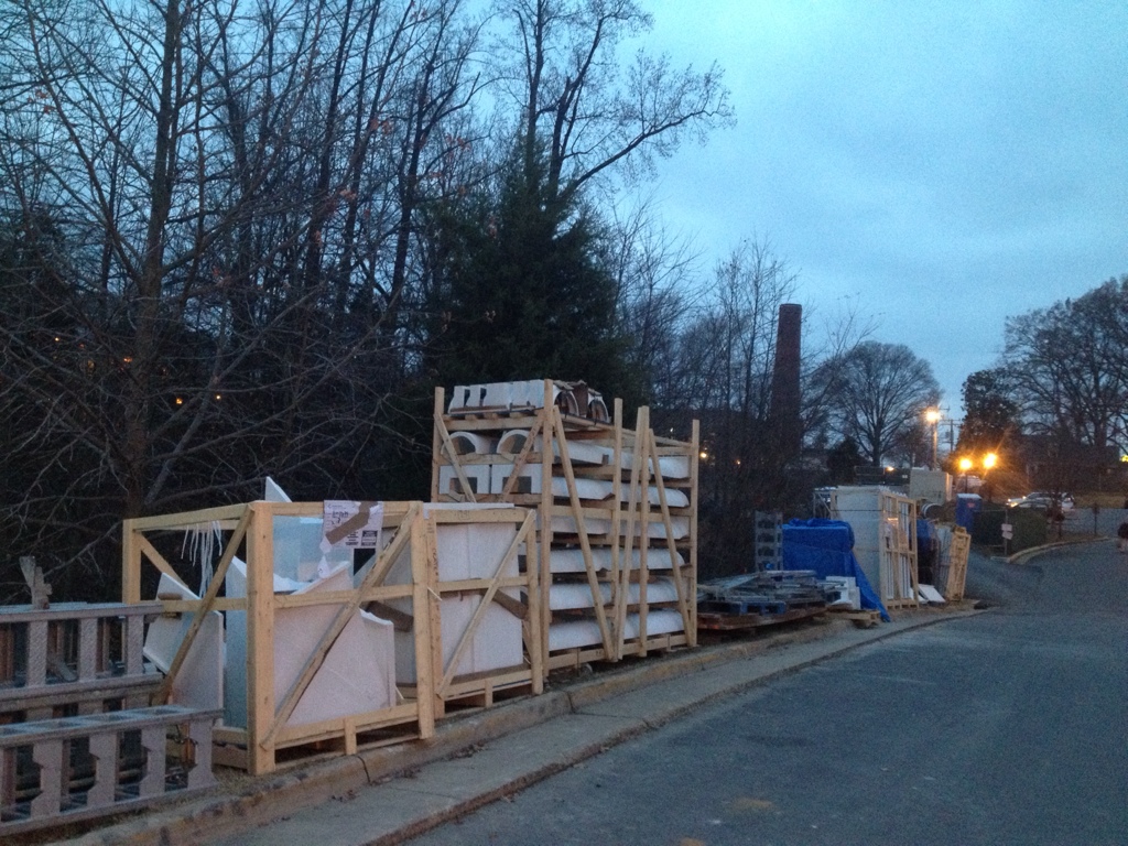 This post is the sequel to last December’s “Columns-n-a-crate,” which are both part of the great series entitled Virginia Architectural Pastiches. The new Campus Center is getting its dormers lowered on with a crane. Must have been acquired at Antebellum Greek Revival Features-R-Us.